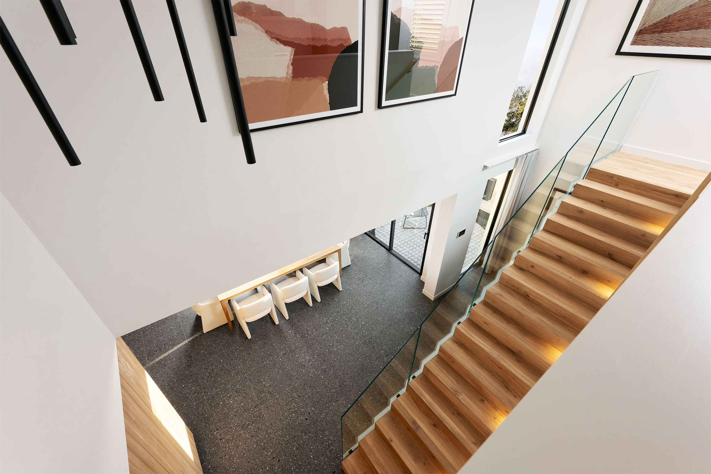 in natural light from the entry void, complemented by controlled light from vertical external Venetian blinds.