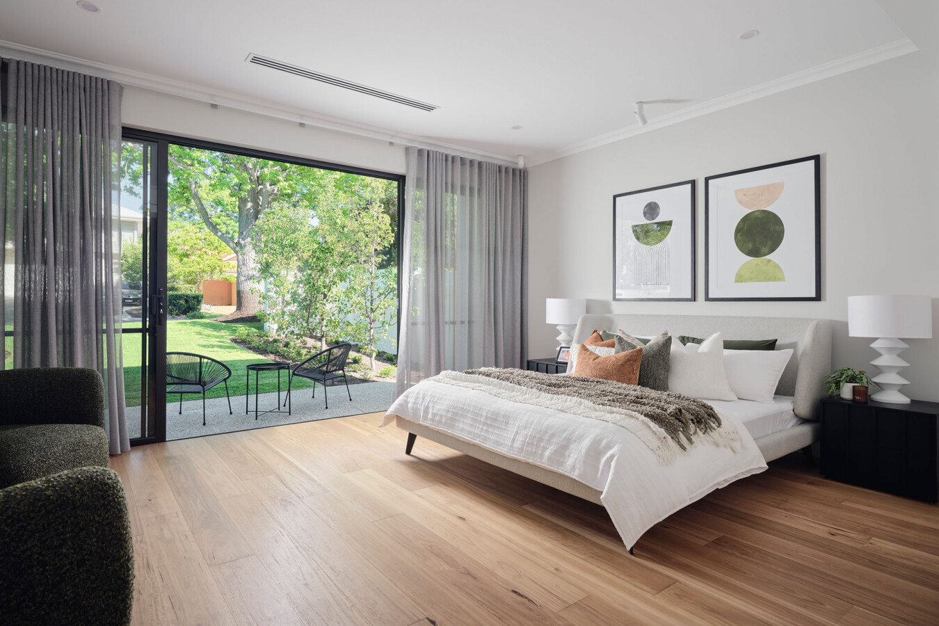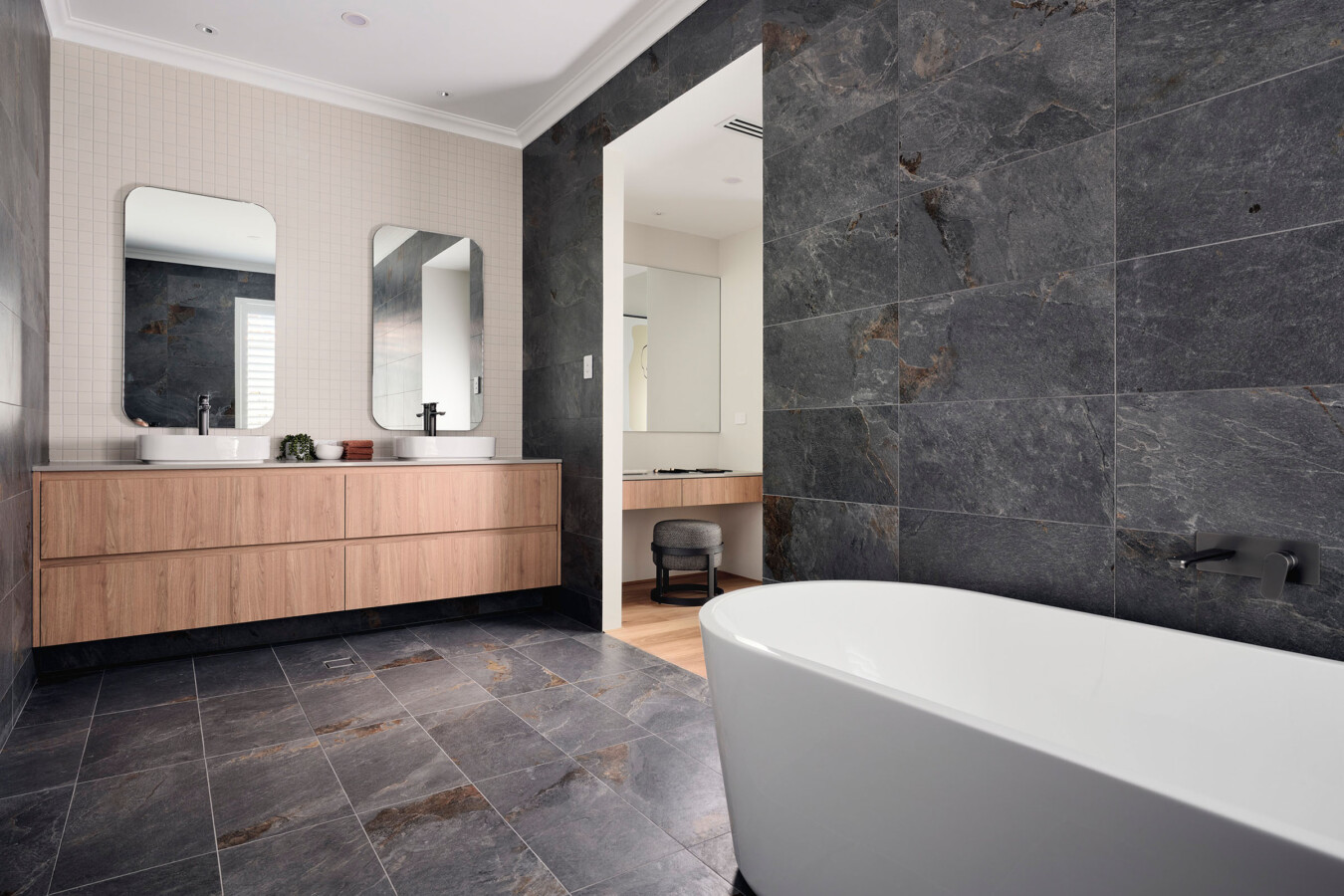 • Natural material palettes, often incorporating timber textures, stone and soft neutral tones