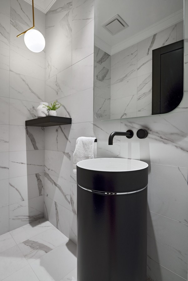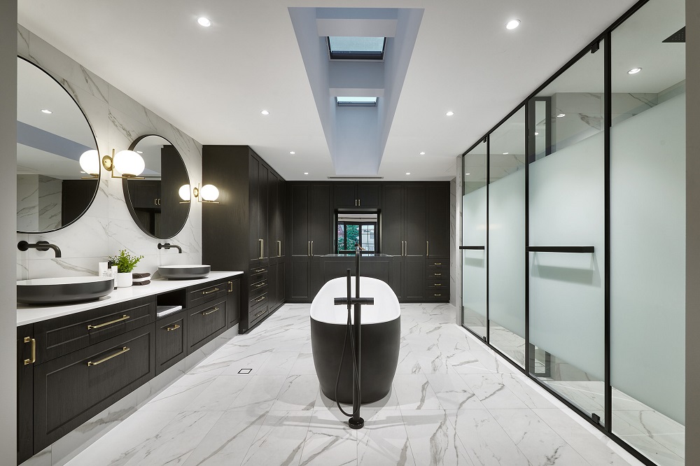 “Pick a shape and a colour and run with it throughout the bathrooms, including the accessories and small accents like handles. Be consistent throughout the home in the shape and profile of a product,”