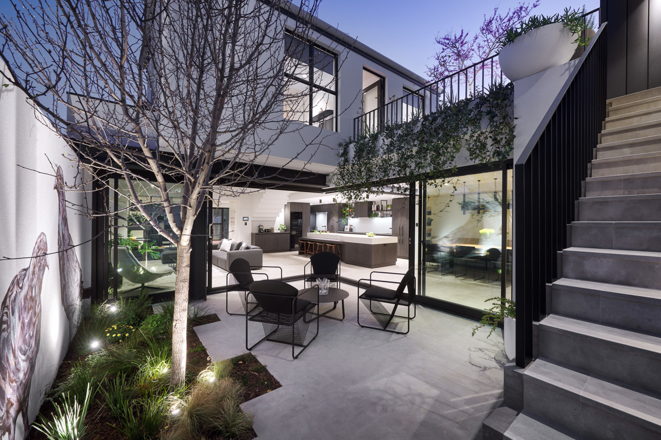 “The Highline’s open plan design encourages entertaining. The oversized commercial stacker doors extend the kitchen, dining and living to a central courtyard surrounded by lush gardens.”