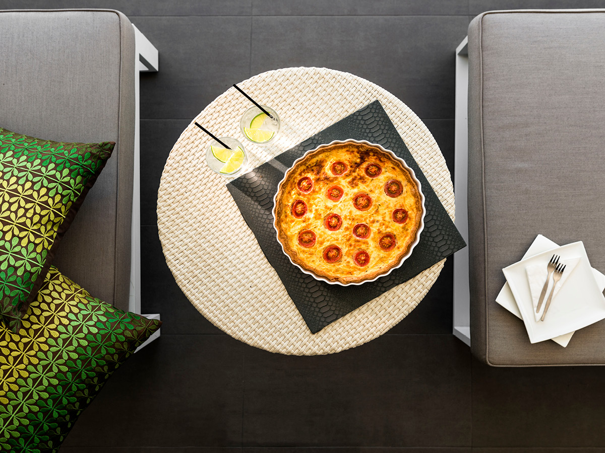 Gently place the cherry tomatoes on top of the mixture. Bake in the oven for 30 minutes until golden.