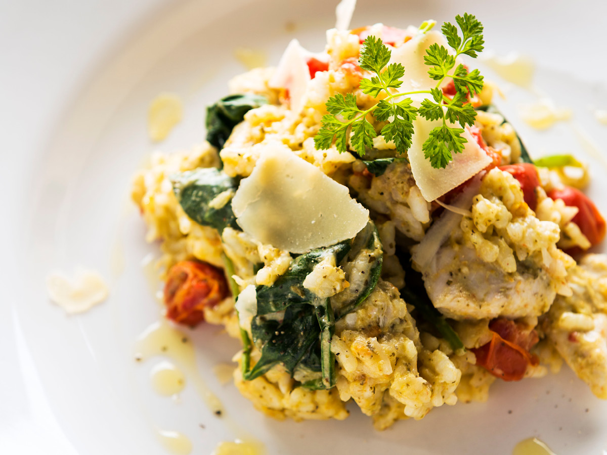 Once rice is cooked remove from heat, mix in chicken (including pesto sauce) and oven roasted cherry tomatoes. When ready to serve stir through baby spinach and garnish with parmesan cheese.