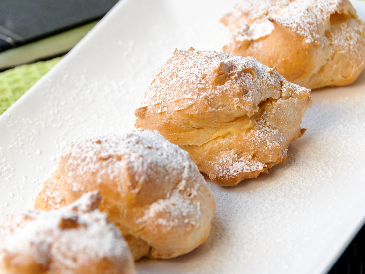 Beat egg yolks with sugar. Add the sifted flour and then the milk. Place lemon rind into the mixture. Cook over low heat stirring constantly until it boils (approx 10-15mins). Once mixture resembles custard texture and thickens, remove from heat and allow to cool slightly. Remove lemon rind. Gently cut the puffs across the middle and spoon in the custard. Dust lightly with icing sugar before serving.